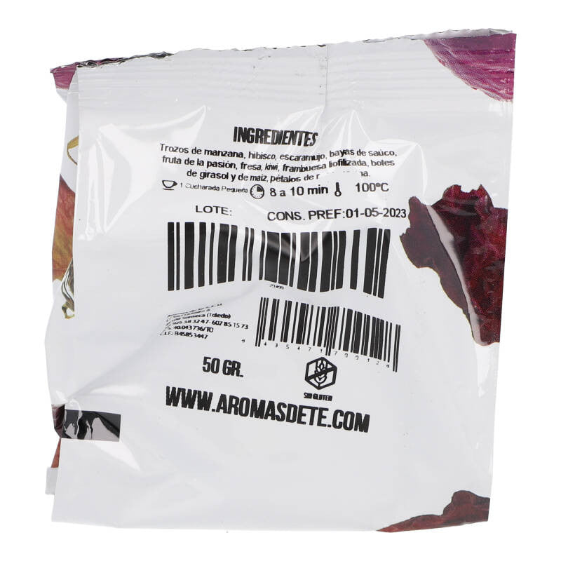 | Ingredientes | Apple pieces, hibiscus, rose hips, elderberries, passion fruit, strawberry, kiwi, freeze-dried raspberry, sunflower sprouts, corn, rose petals, aroma |
