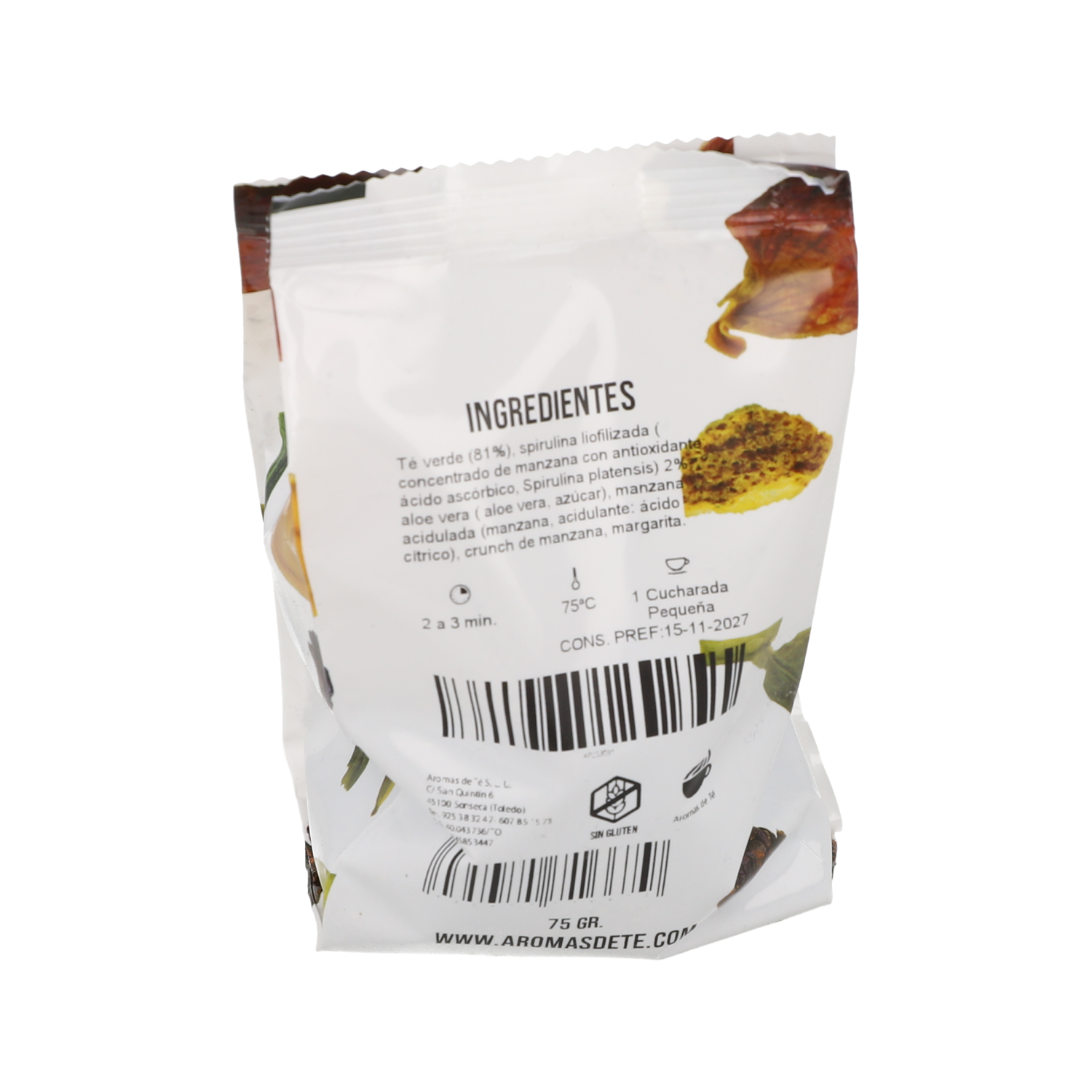 Ingredientes Té verde (81 %), aloe vera confitada (aloe vera, azúcar), pedacitos de manzana acidulada (manzana, acidulante: ácido cítrico), aroma, crunchy de manzana y spirulina liofilizado (concentrado de puré de manzana con antioxidante: ácido ascórbico, Spirulina platensis) (2%), margarita entera