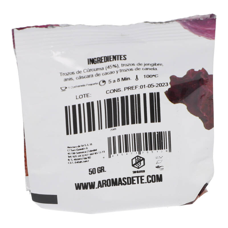 | Ingredientes | Pezzi di curcuma (45%), pezzi di zenzero, anice, guscio di cacao, pezzi di cannella |