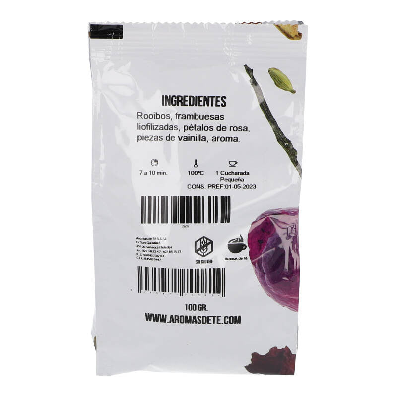 | Ingredientes | Rooibos, frambuesas liofilizadas, pétalos de rosa, piezas de vainilla, aroma |