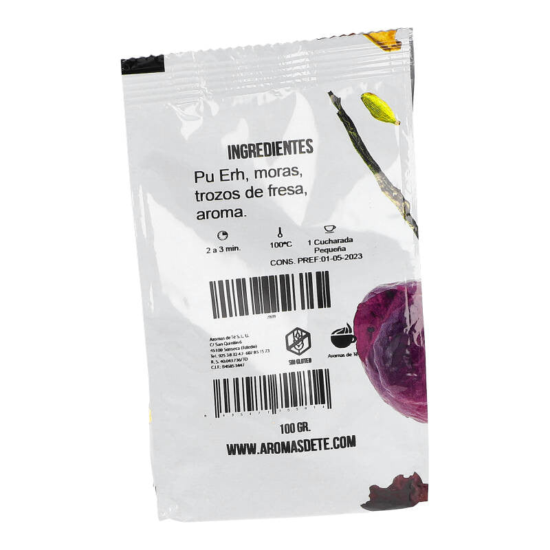 | Ingredientes | Pu Erh, moras, trozos de fresa, aroma |