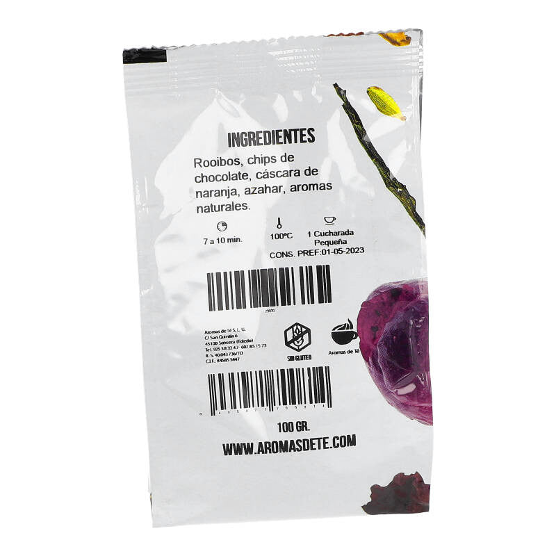 | Ingredientes | Rooibos, chips de chocolate, cáscara de naranja, azahar, aromas naturales |
